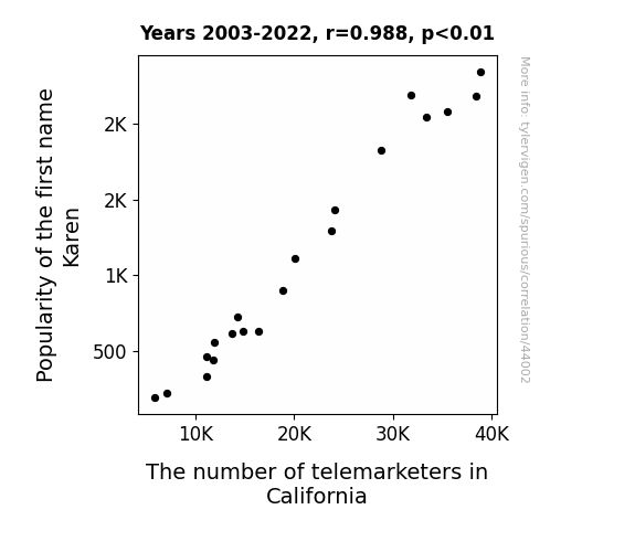 This means 97.7% of the change in the one variable (i.e., The number of telemarketers in California) is predictable based on the change in the other (i.e., Popularity of the first name Karen) over the 20 years from 2003 through 2022.