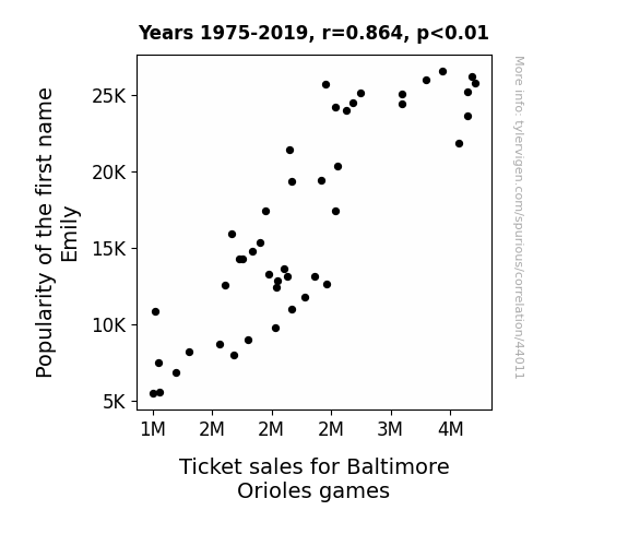 This means 74.6% of the change in the one variable (i.e., Ticket sales for Baltimore Orioles games) is predictable based on the change in the other (i.e., Popularity of the first name Emily) over the 45 years from 1975 through 2019.