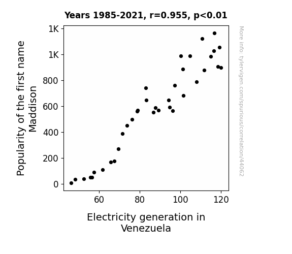 This means 91.3% of the change in the one variable (i.e., Electricity generation in Venezuela) is predictable based on the change in the other (i.e., Popularity of the first name Maddison) over the 37 years from 1985 through 2021.