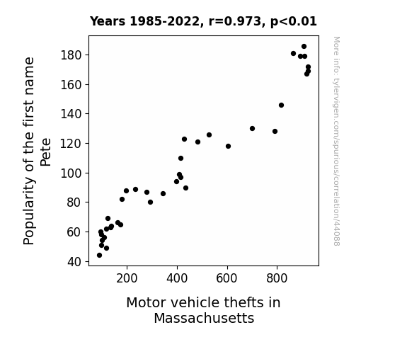 This means 94.7% of the change in the one variable (i.e., Motor vehicle thefts in Massachusetts) is predictable based on the change in the other (i.e., Popularity of the first name Pete) over the 38 years from 1985 through 2022.