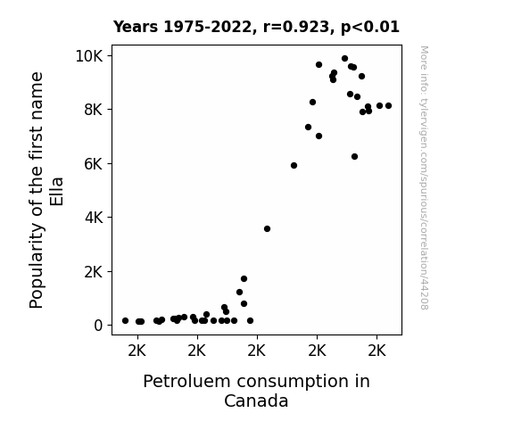 This means 85.2% of the change in the one variable (i.e., Petroluem consumption in Canada) is predictable based on the change in the other (i.e., Popularity of the first name Ella) over the 48 years from 1975 through 2022.