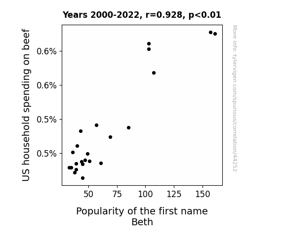 This means 86.1% of the change in the one variable (i.e., Popularity of the first name Beth) is predictable based on the change in the other (i.e., US household spending on beef) over the 23 years from 2000 through 2022.