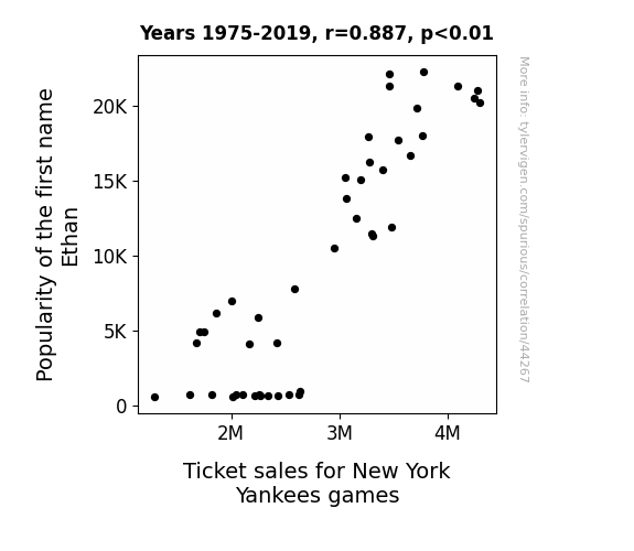 This means 78.7% of the change in the one variable (i.e., Ticket sales for New York Yankees games) is predictable based on the change in the other (i.e., Popularity of the first name Ethan) over the 45 years from 1975 through 2019.