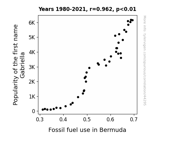 This means 92.5% of the change in the one variable (i.e., Fossil fuel use in Bermuda) is predictable based on the change in the other (i.e., Popularity of the first name Gabriella) over the 42 years from 1980 through 2021.