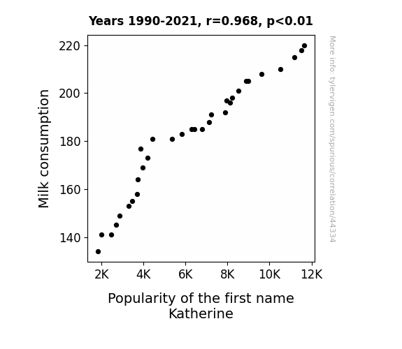 This means 93.7% of the change in the one variable (i.e., Popularity of the first name Katherine) is predictable based on the change in the other (i.e., Milk consumption) over the 32 years from 1990 through 2021.