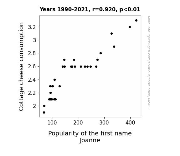 This means 84.6% of the change in the one variable (i.e., Popularity of the first name Joanne) is predictable based on the change in the other (i.e., Cottage cheese consumption) over the 32 years from 1990 through 2021.
