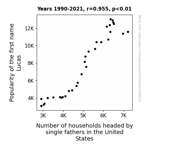 This means 91.2% of the change in the one variable (i.e., Number of households headed by single fathers in the United States) is predictable based on the change in the other (i.e., Popularity of the first name Lucas) over the 32 years from 1990 through 2021.