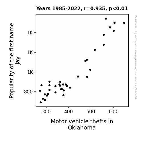 This means 87.5% of the change in the one variable (i.e., Motor vehicle thefts in Oklahoma) is predictable based on the change in the other (i.e., Popularity of the first name Jay) over the 38 years from 1985 through 2022.