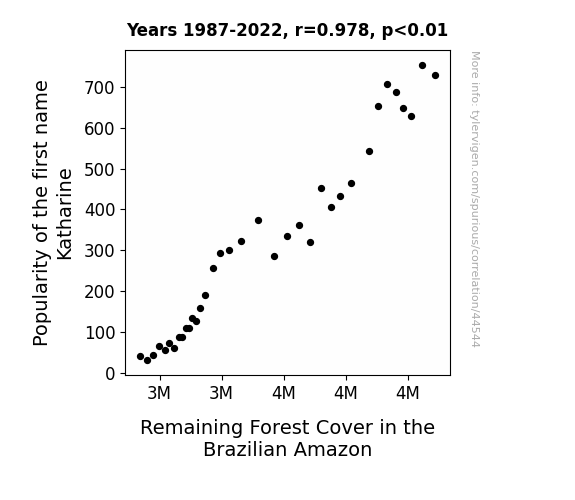 This means 95.6% of the change in the one variable (i.e., Remaining Forest Cover in the Brazilian Amazon) is predictable based on the change in the other (i.e., Popularity of the first name Katharine) over the 36 years from 1987 through 2022.
