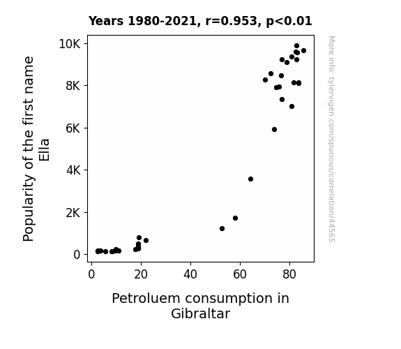This means 90.8% of the change in the one variable (i.e., Petroluem consumption in Gibraltar) is predictable based on the change in the other (i.e., Popularity of the first name Ella) over the 42 years from 1980 through 2021.