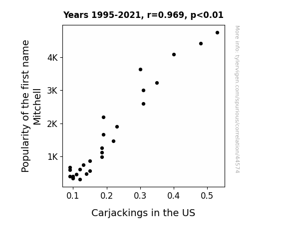 This means 93.9% of the change in the one variable (i.e., Carjackings in the US) is predictable based on the change in the other (i.e., Popularity of the first name Mitchell) over the 27 years from 1995 through 2021.