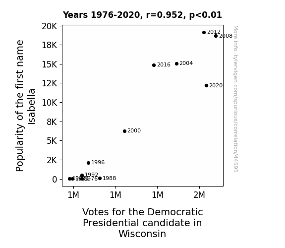 This means 90.6% of the change in the one variable (i.e., Votes for the Democratic Presidential candidate in Wisconsin) is predictable based on the change in the other (i.e., Popularity of the first name Isabella) over the 12 years from 1976 through 2020.
