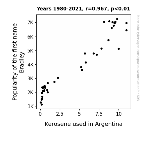 This means 93.5% of the change in the one variable (i.e., Kerosene used in Argentina) is predictable based on the change in the other (i.e., Popularity of the first name Bradley) over the 42 years from 1980 through 2021.