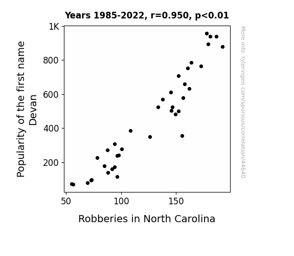 This means 90.3% of the change in the one variable (i.e., Robberies in North Carolina) is predictable based on the change in the other (i.e., Popularity of the first name Devan) over the 38 years from 1985 through 2022.