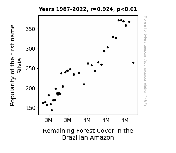 This means 85.4% of the change in the one variable (i.e., Remaining Forest Cover in the Brazilian Amazon) is predictable based on the change in the other (i.e., Popularity of the first name Silvia) over the 36 years from 1987 through 2022.