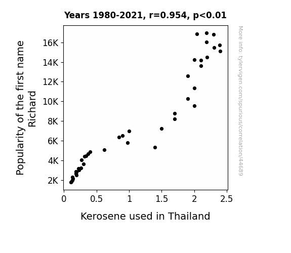 This means 91.1% of the change in the one variable (i.e., Kerosene used in Thailand) is predictable based on the change in the other (i.e., Popularity of the first name Richard) over the 42 years from 1980 through 2021.