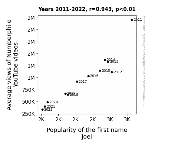This means 89% of the change in the one variable (i.e., Popularity of the first name Joel) is predictable based on the change in the other (i.e., Average views of Numberphile YouTube videos) over the 12 years from 2011 through 2022.