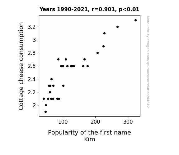 This means 81.1% of the change in the one variable (i.e., Popularity of the first name Kim) is predictable based on the change in the other (i.e., Cottage cheese consumption) over the 32 years from 1990 through 2021.
