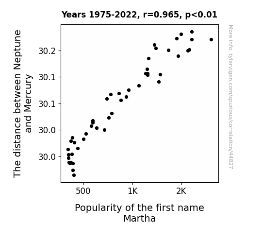 This means 93.2% of the change in the one variable (i.e., Popularity of the first name Martha) is predictable based on the change in the other (i.e., The distance between Neptune and Mercury) over the 48 years from 1975 through 2022.