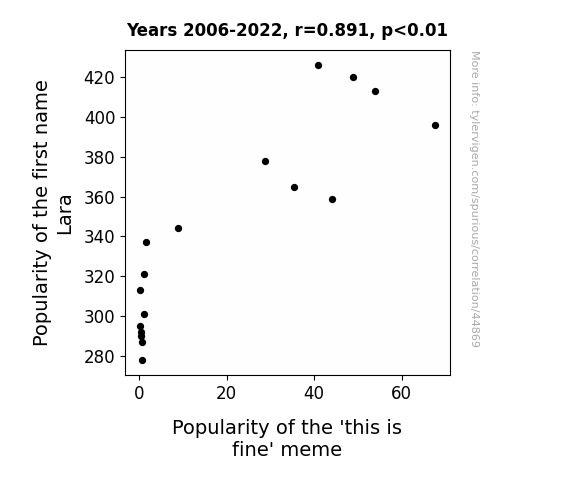 This means 79.4% of the change in the one variable (i.e., Popularity of the 'this is fine' meme) is predictable based on the change in the other (i.e., Popularity of the first name Lara) over the 17 years from 2006 through 2022.