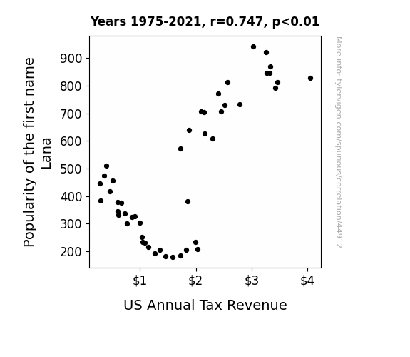 This means 55.8% of the change in the one variable (i.e., US Annual Tax Revenue) is predictable based on the change in the other (i.e., Popularity of the first name Lana) over the 47 years from 1975 through 2021.