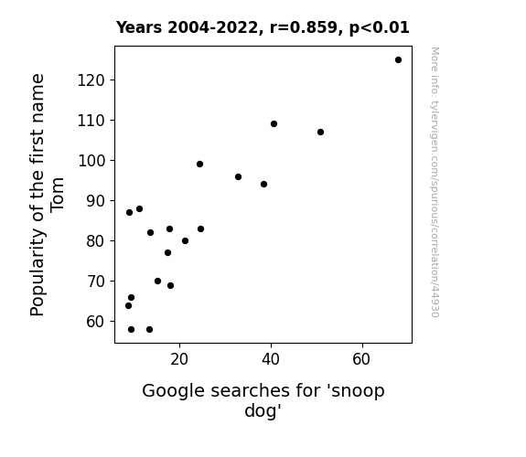 This means 73.8% of the change in the one variable (i.e., Google searches for 'snoop dog') is predictable based on the change in the other (i.e., Popularity of the first name Tom) over the 19 years from 2004 through 2022.
