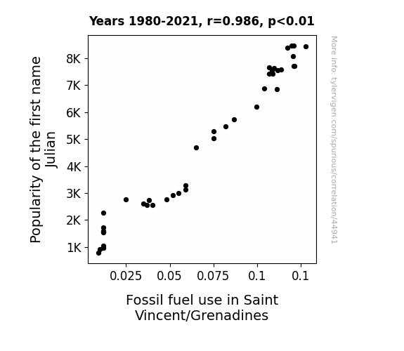 This means 97.2% of the change in the one variable (i.e., Fossil fuel use in Saint Vincent/Grenadines) is predictable based on the change in the other (i.e., Popularity of the first name Julian) over the 42 years from 1980 through 2021.