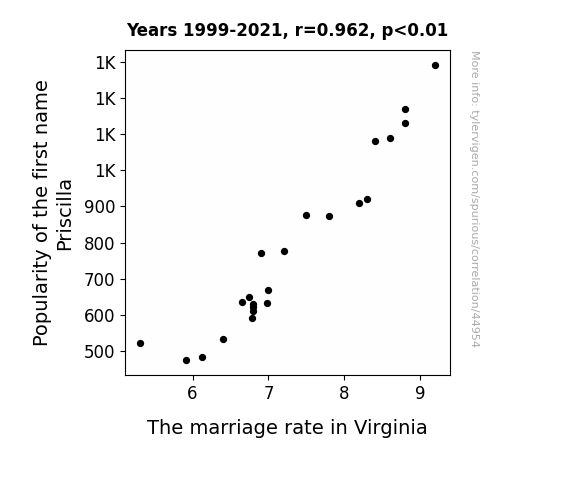 This means 92.5% of the change in the one variable (i.e., The marriage rate in Virginia) is predictable based on the change in the other (i.e., Popularity of the first name Priscilla) over the 23 years from 1999 through 2021.