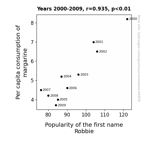 This means 87.4% of the change in the one variable (i.e., Popularity of the first name Robbie) is predictable based on the change in the other (i.e., Per capita consumption of margarine) over the 10 years from 2000 through 2009.