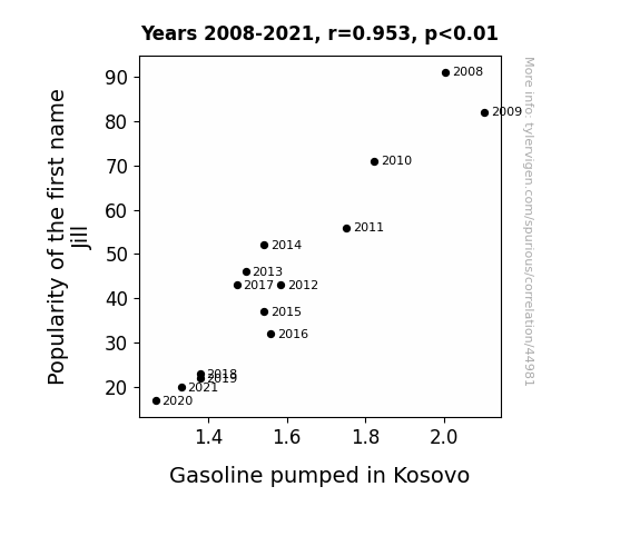 This means 90.9% of the change in the one variable (i.e., Gasoline pumped in Kosovo) is predictable based on the change in the other (i.e., Popularity of the first name Jill) over the 14 years from 2008 through 2021.