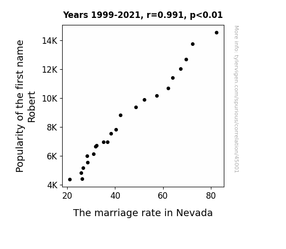 This means 98.2% of the change in the one variable (i.e., The marriage rate in Nevada) is predictable based on the change in the other (i.e., Popularity of the first name Robert) over the 23 years from 1999 through 2021.