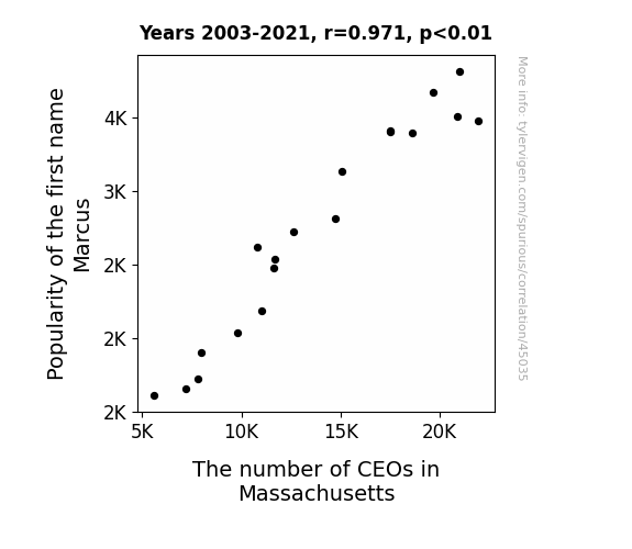 This means 94.3% of the change in the one variable (i.e., The number of CEOs in Massachusetts) is predictable based on the change in the other (i.e., Popularity of the first name Marcus) over the 19 years from 2003 through 2021.