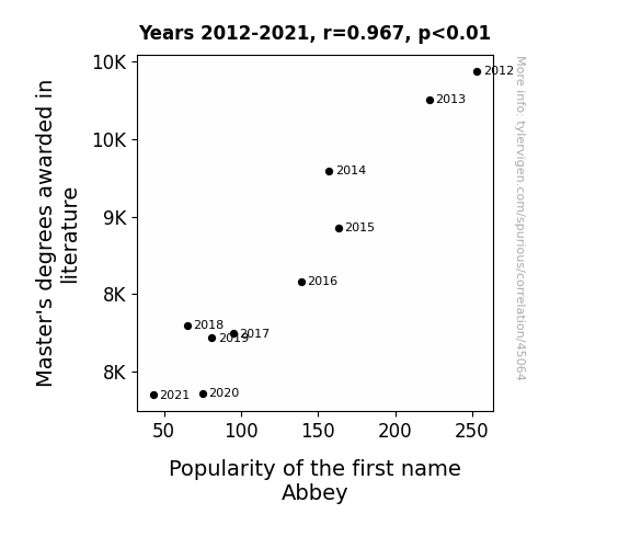 This means 93.6% of the change in the one variable (i.e., Popularity of the first name Abbey) is predictable based on the change in the other (i.e., Master's degrees awarded in literature) over the 10 years from 2012 through 2021.