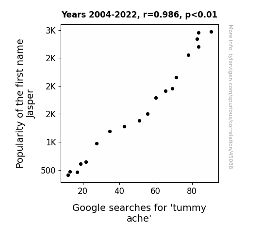 This means 97.2% of the change in the one variable (i.e., Google searches for 'tummy ache') is predictable based on the change in the other (i.e., Popularity of the first name Jasper) over the 19 years from 2004 through 2022.