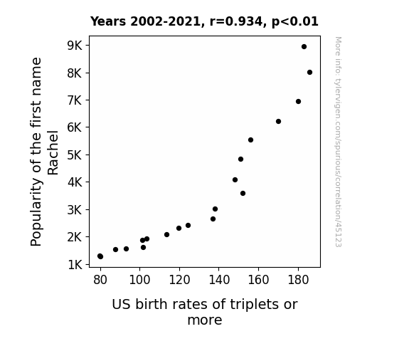 This means 87.3% of the change in the one variable (i.e., US birth rates of triplets or more) is predictable based on the change in the other (i.e., Popularity of the first name Rachel) over the 20 years from 2002 through 2021.