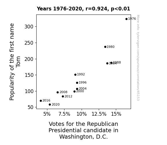 This means 85.4% of the change in the one variable (i.e., Votes for the Republican Presidential candidate in Washington, D.C.) is predictable based on the change in the other (i.e., Popularity of the first name Tom) over the 12 years from 1976 through 2020.