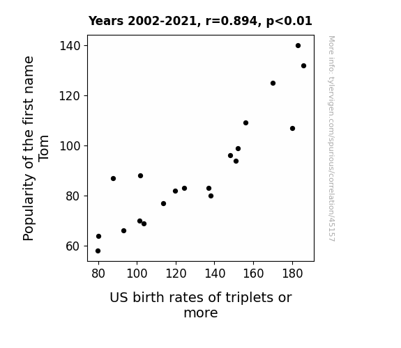This means 80% of the change in the one variable (i.e., US birth rates of triplets or more) is predictable based on the change in the other (i.e., Popularity of the first name Tom) over the 20 years from 2002 through 2021.