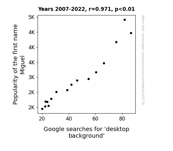 This means 94.2% of the change in the one variable (i.e., Google searches for 'desktop background') is predictable based on the change in the other (i.e., Popularity of the first name Miguel) over the 16 years from 2007 through 2022.