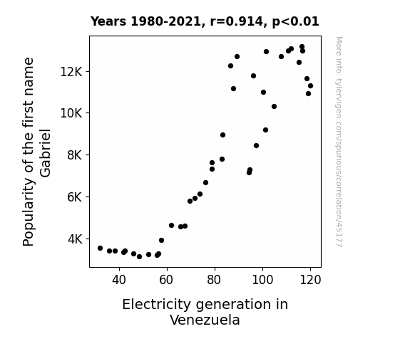 This means 83.6% of the change in the one variable (i.e., Electricity generation in Venezuela) is predictable based on the change in the other (i.e., Popularity of the first name Gabriel) over the 42 years from 1980 through 2021.