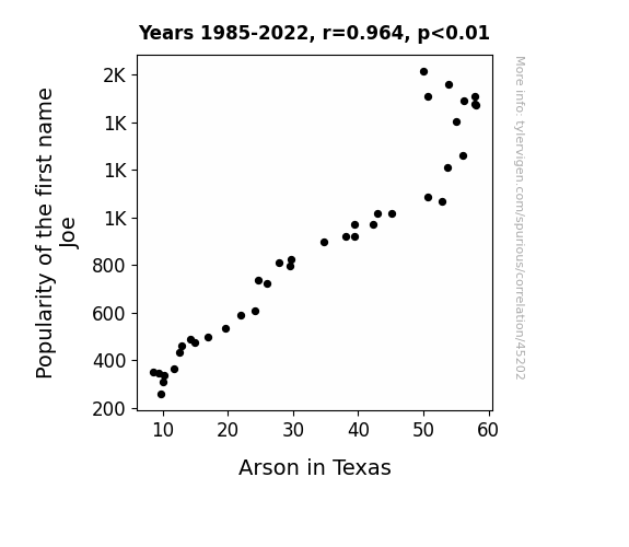 This means 93% of the change in the one variable (i.e., Arson in Texas) is predictable based on the change in the other (i.e., Popularity of the first name Joe) over the 38 years from 1985 through 2022.