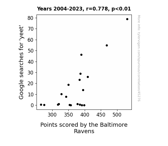 This means 60.6% of the change in the one variable (i.e., Points scored by the Baltimore Ravens) is predictable based on the change in the other (i.e., Google searches for 'yeet') over the 20 years from 2004 through 2023.