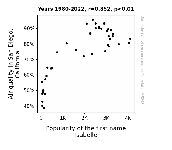 This means 72.6% of the change in the one variable (i.e., Popularity of the first name Isabelle) is predictable based on the change in the other (i.e., Air quality in San Diego, California) over the 43 years from 1980 through 2022.
