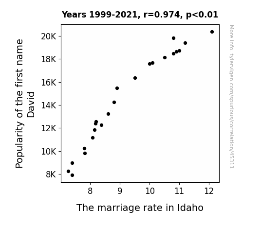 This means 94.8% of the change in the one variable (i.e., The marriage rate in Idaho) is predictable based on the change in the other (i.e., Popularity of the first name David) over the 23 years from 1999 through 2021.