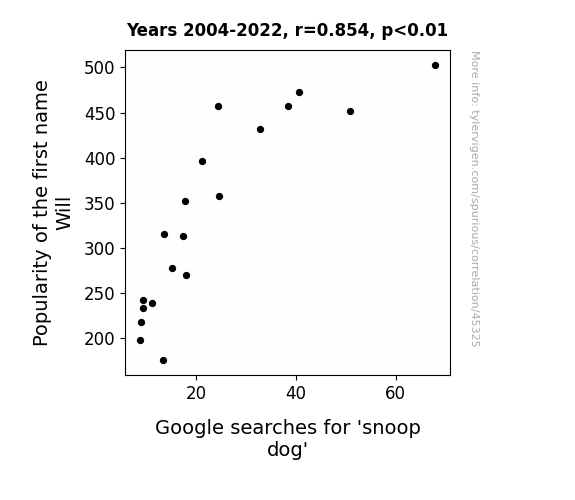 This means 73% of the change in the one variable (i.e., Google searches for 'snoop dog') is predictable based on the change in the other (i.e., Popularity of the first name Will) over the 19 years from 2004 through 2022.