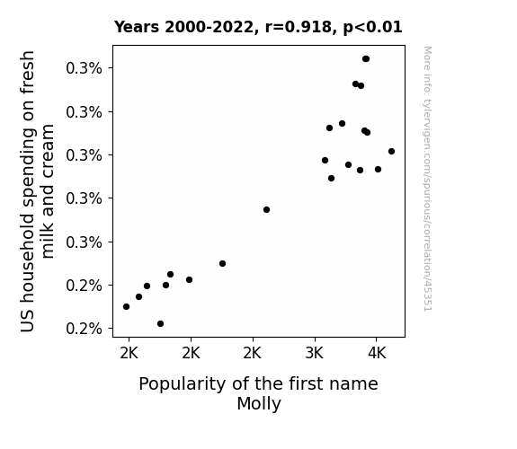 This means 84.4% of the change in the one variable (i.e., Popularity of the first name Molly) is predictable based on the change in the other (i.e., US household spending on fresh milk and cream) over the 23 years from 2000 through 2022.