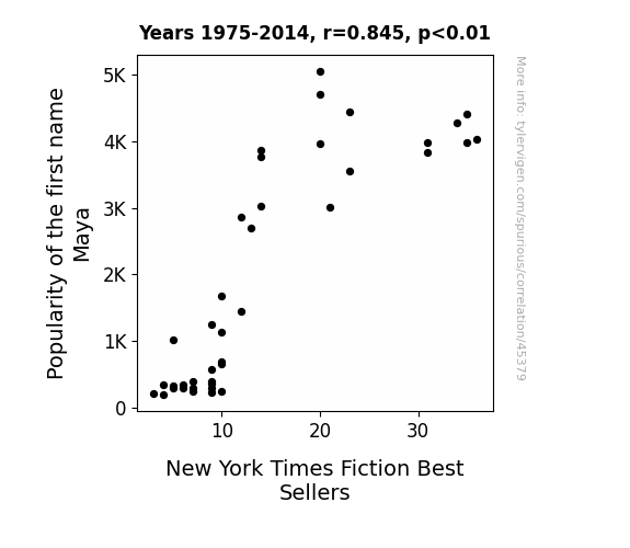 This means 71.5% of the change in the one variable (i.e., New York Times Fiction Best Sellers) is predictable based on the change in the other (i.e., Popularity of the first name Maya) over the 40 years from 1975 through 2014.