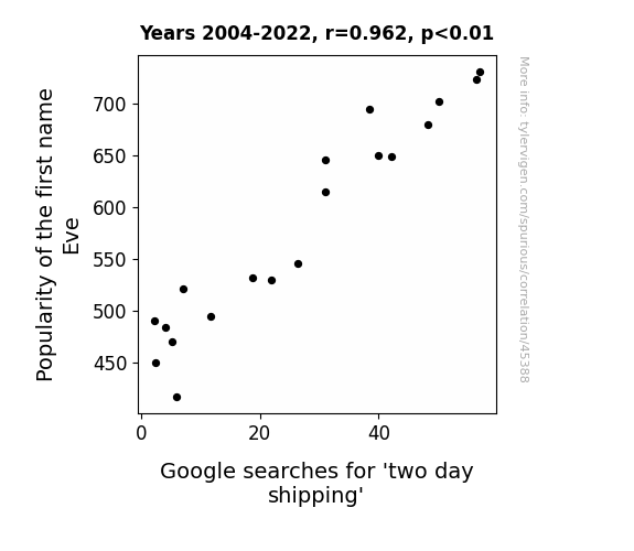 This means 92.6% of the change in the one variable (i.e., Google searches for 'two day shipping') is predictable based on the change in the other (i.e., Popularity of the first name Eve) over the 19 years from 2004 through 2022.