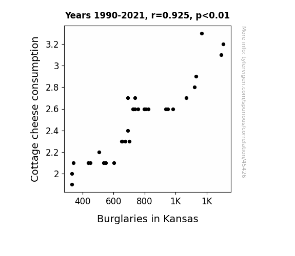 This means 85.6% of the change in the one variable (i.e., Burglaries in Kansas) is predictable based on the change in the other (i.e., Cottage cheese consumption) over the 32 years from 1990 through 2021.