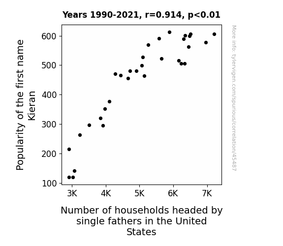 This means 83.5% of the change in the one variable (i.e., Number of households headed by single fathers in the United States) is predictable based on the change in the other (i.e., Popularity of the first name Kieran) over the 32 years from 1990 through 2021.