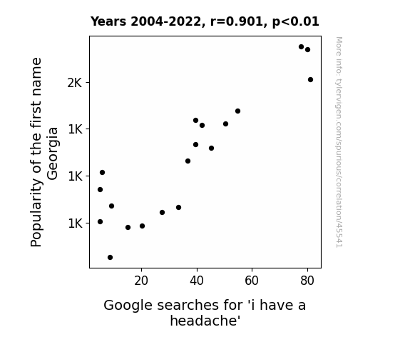 This means 81.2% of the change in the one variable (i.e., Google searches for 'i have a headache') is predictable based on the change in the other (i.e., Popularity of the first name Georgia) over the 19 years from 2004 through 2022.